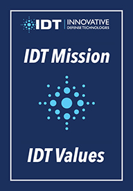 At IDT, we are passionate about our mission, which is to deliver disruptive innovation with the goal of dramatically improving the quality and accelerating the delivery of capabilities to the warfighter. We pursue this mission with discipline…and collectively strive to realize the following corporate values: